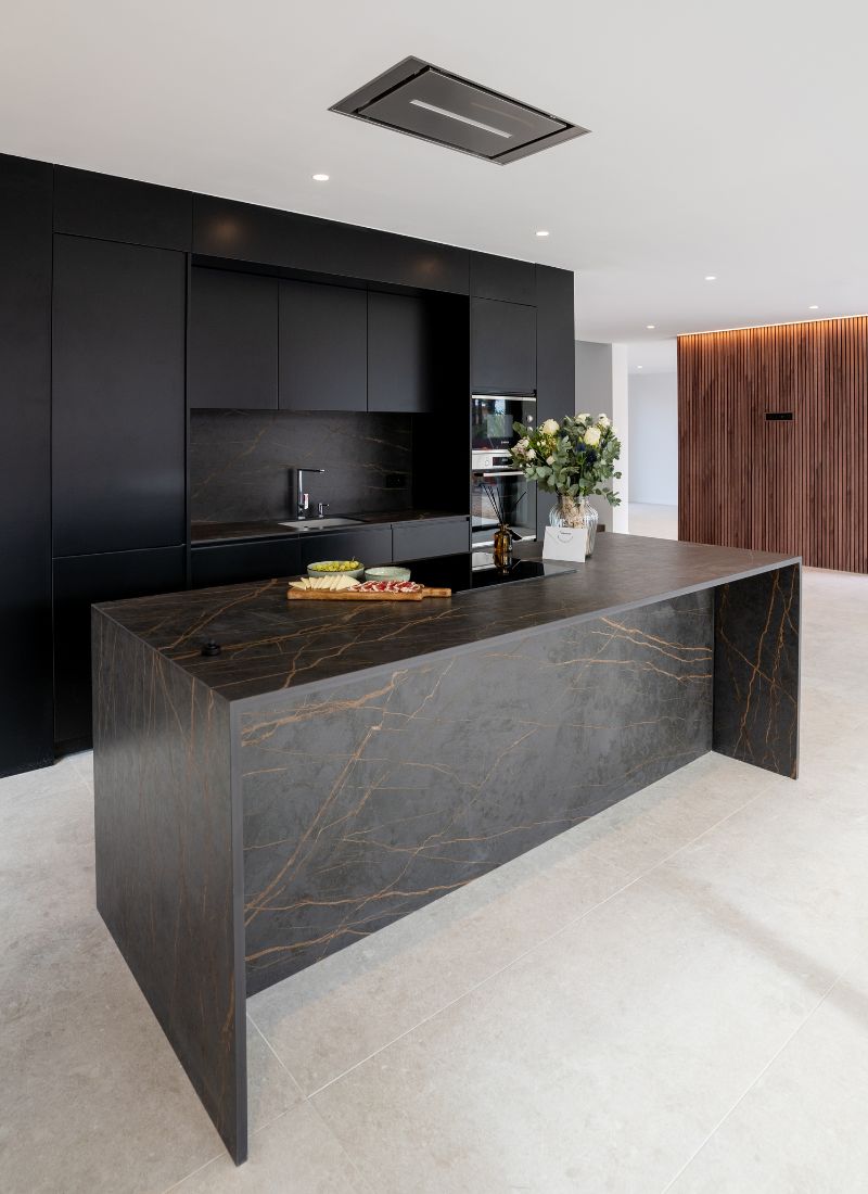 A Bonifacio-style house with a conventional layout and an L-shaped design centred around the living area and swimming pool. There is a strong contrast in the exterior materials, with three key elements in Mediterranean designs: wood, stone and porcelain stoneware. In total, there are three bedrooms, including a full suite with a dressing room, a study and an open-plan area comprising the living room, dining room and kitchen.