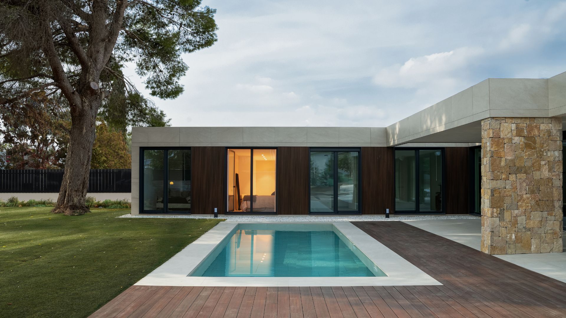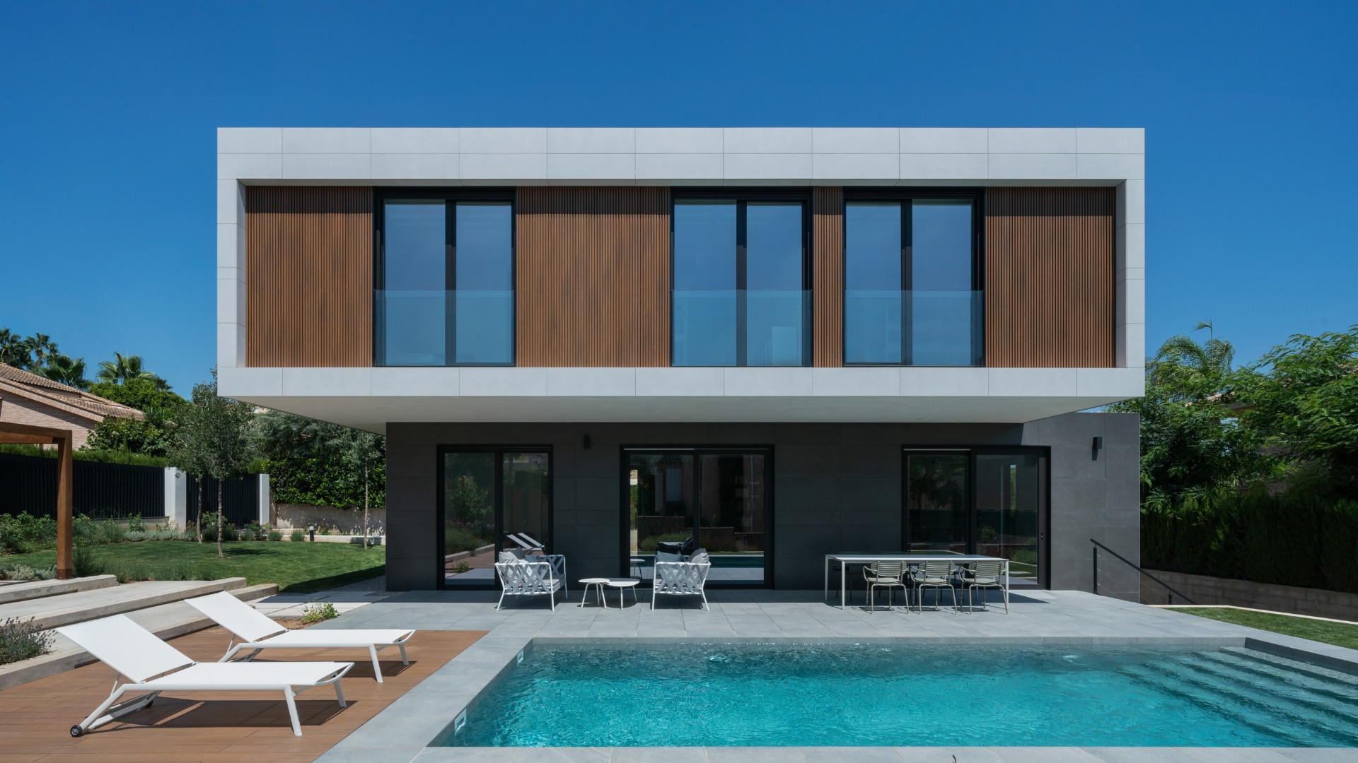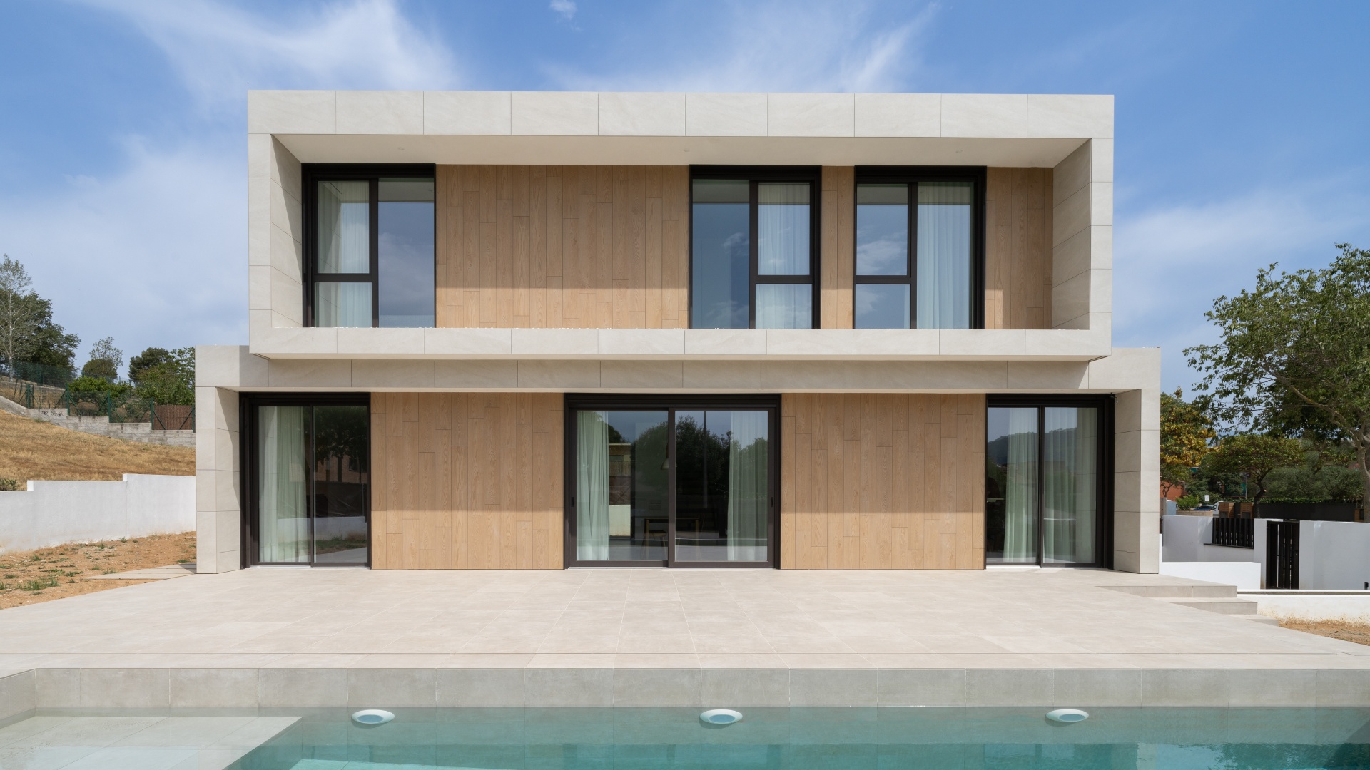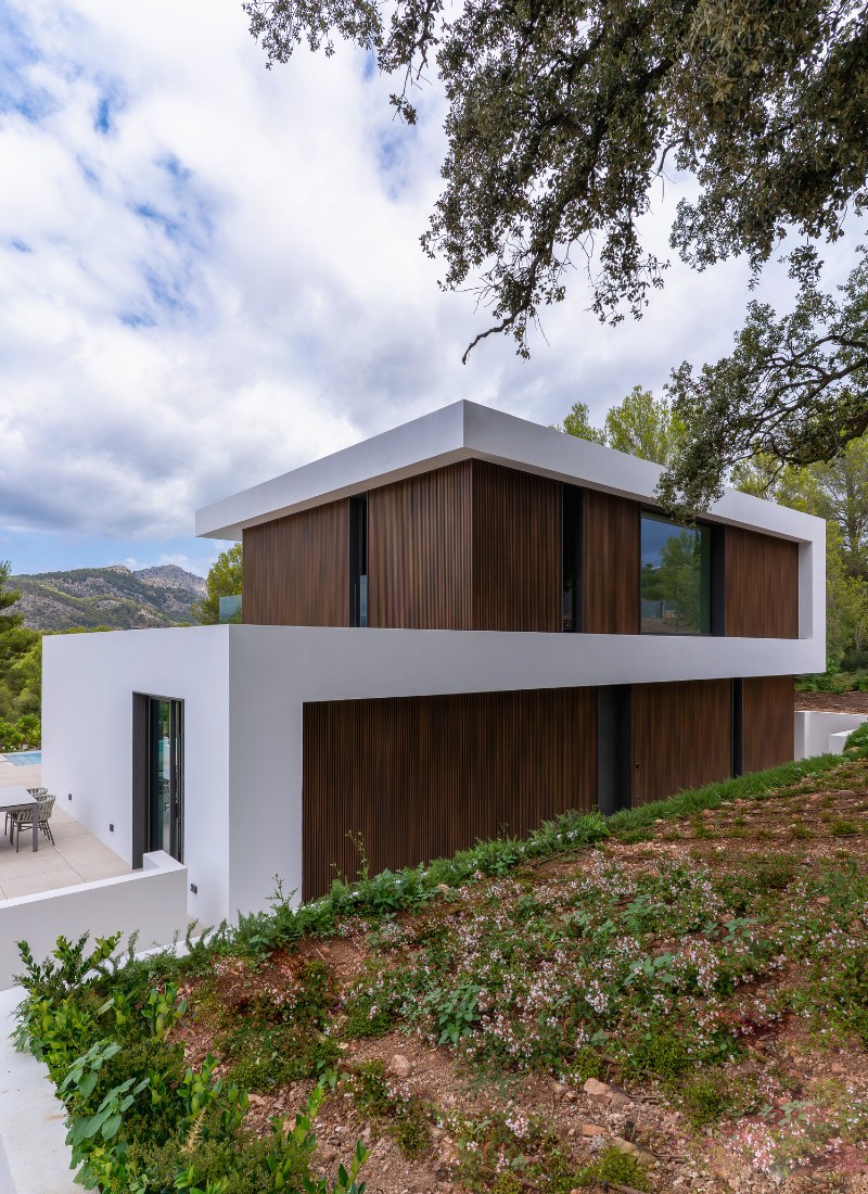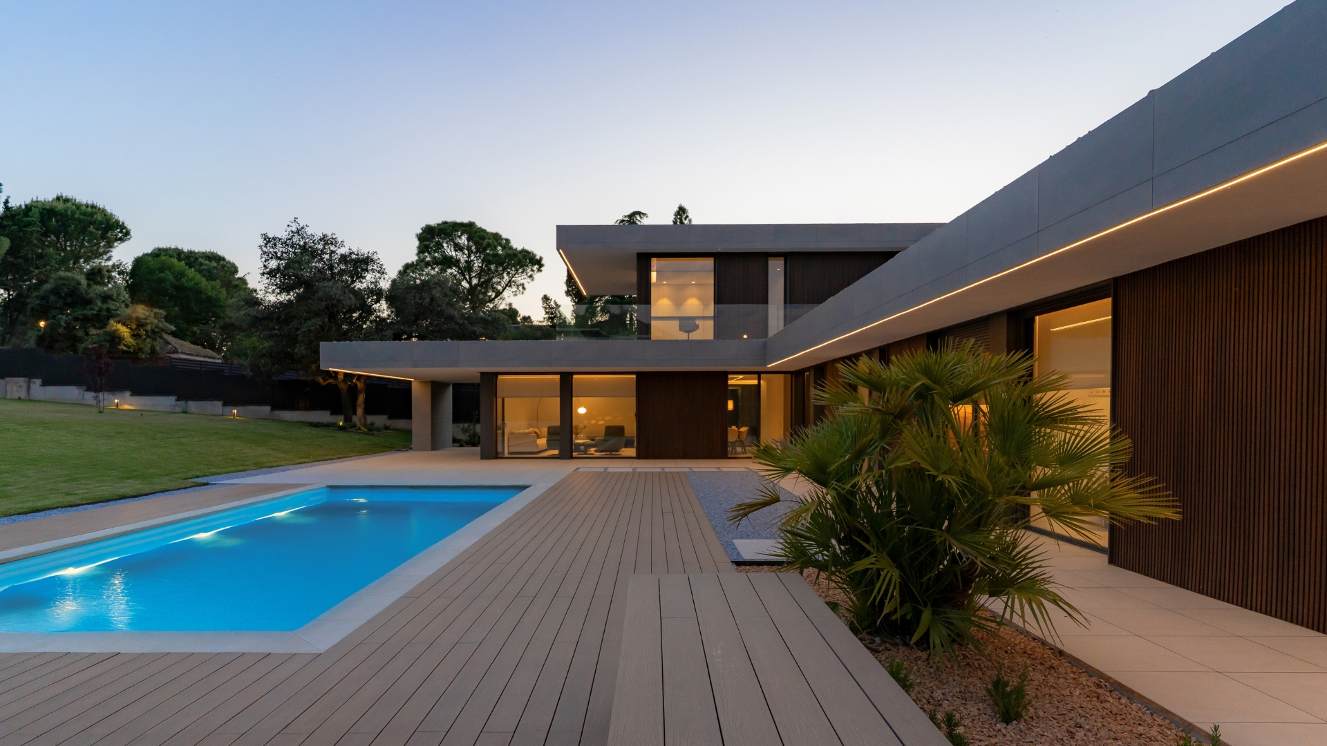 Luxury house with a total surface area of 331 m², with a wooden façade and large corbels. An O-shaped house spread over two floors, whose façade stands out for its corbels and its Mediterranean and modern aesthetic. Interior design and urbanisation project carried out by inHAUS, with brands such as Porcelanosa, Rimadesio, Santos, Marset...