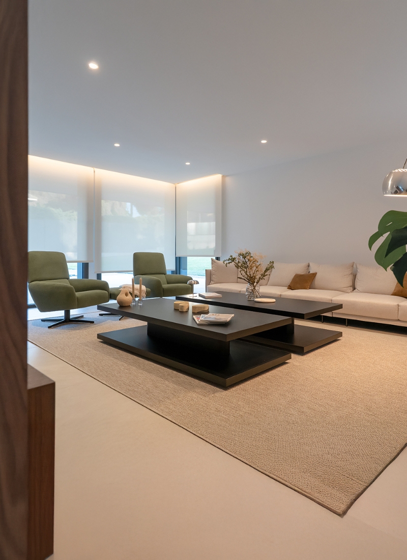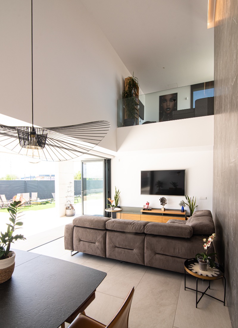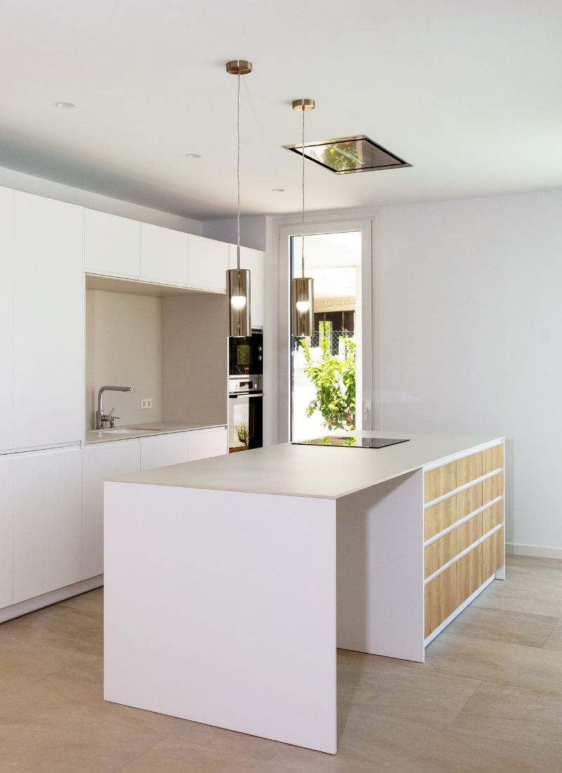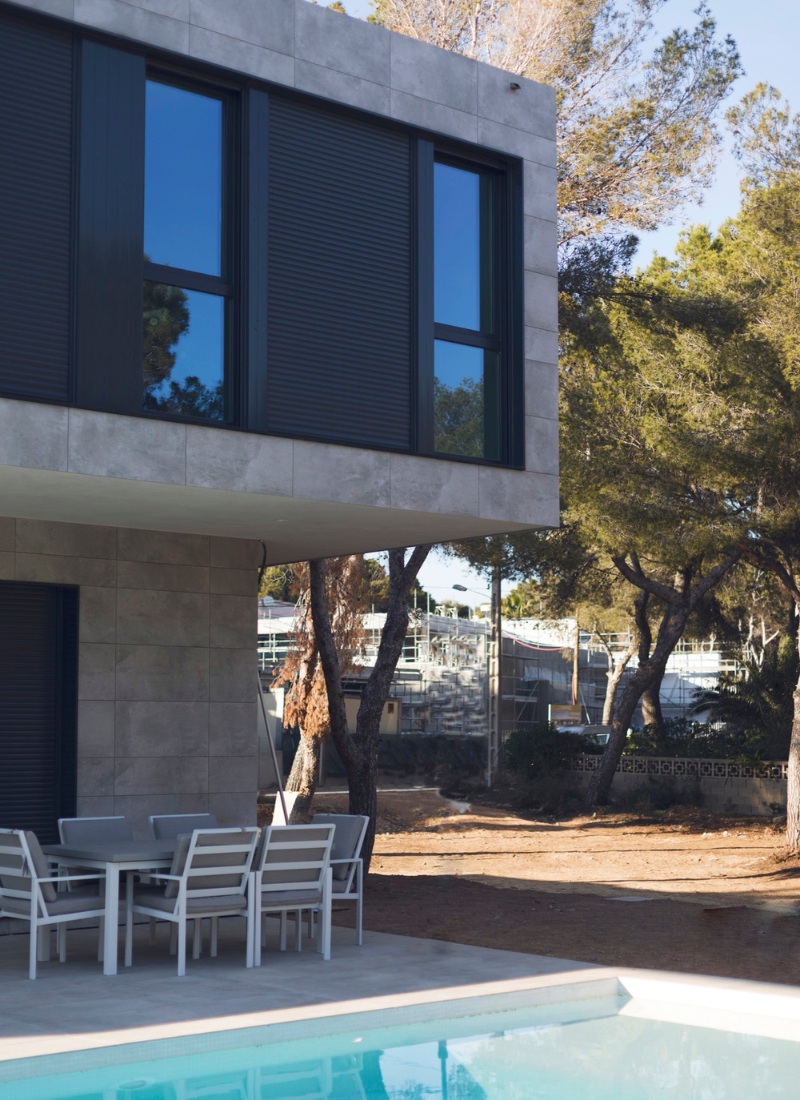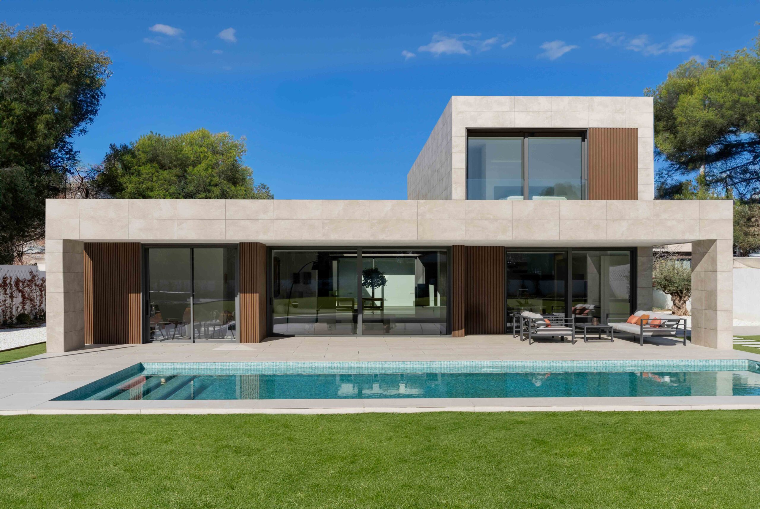 Luxury house with a total surface area of 331 m², with a wooden façade and large corbels. An O-shaped house spread over two floors, whose façade stands out for its corbels and its Mediterranean and modern aesthetic. Interior design and urbanisation project carried out by inHAUS, with brands such as Porcelanosa, Rimadesio, Santos, Marset...