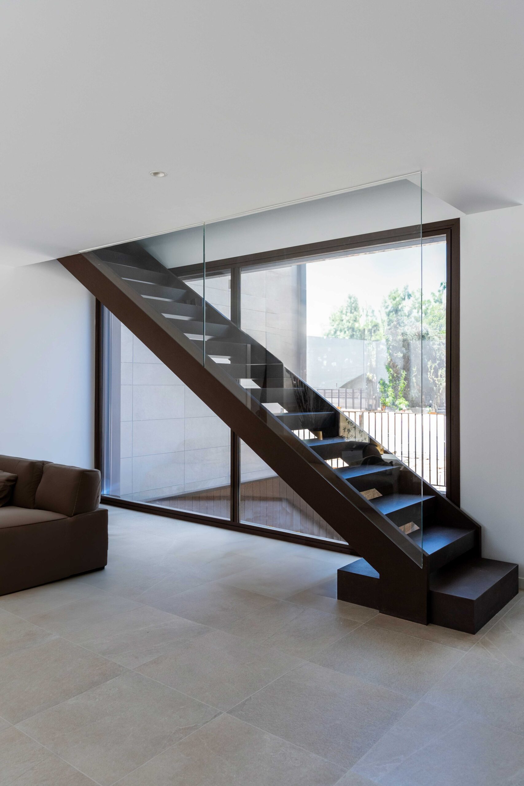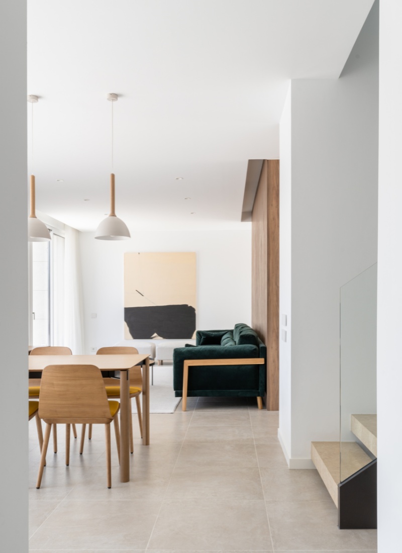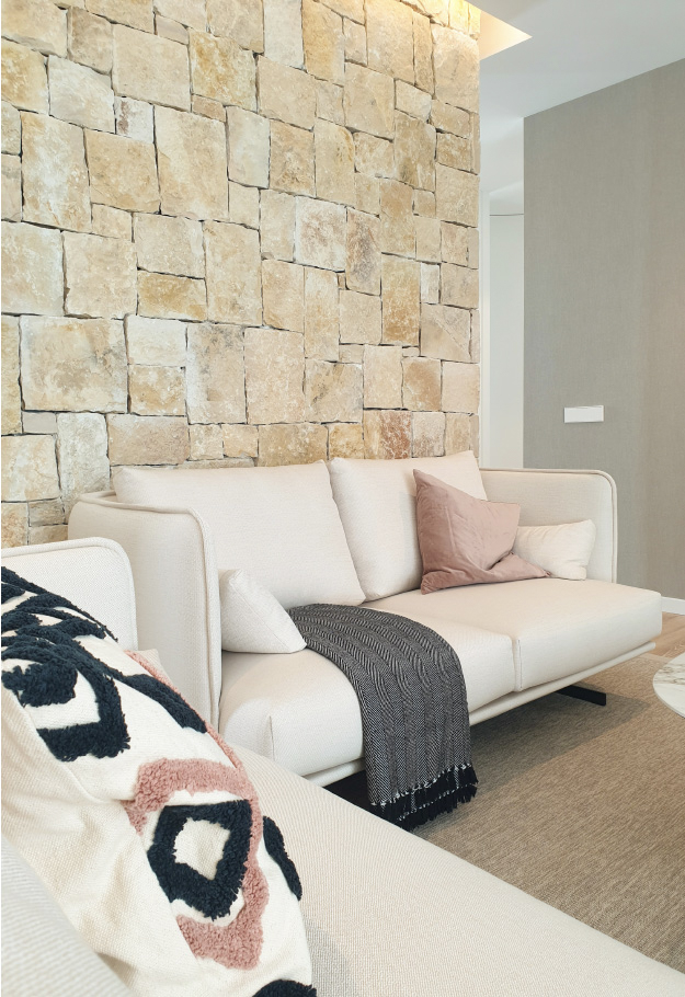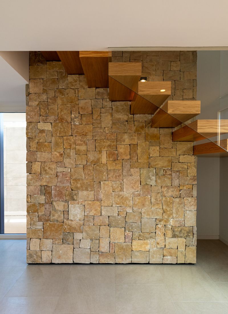 The texture of natural stone is repeated from the façade to the interior of the house, bringing warmth to the domestic space. Soft tones are reflected in the interior design, both in the architectural textures and in the furniture that complements the design.