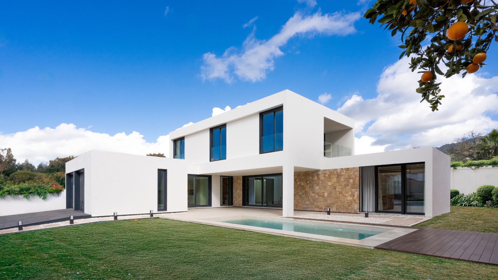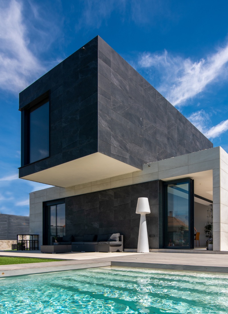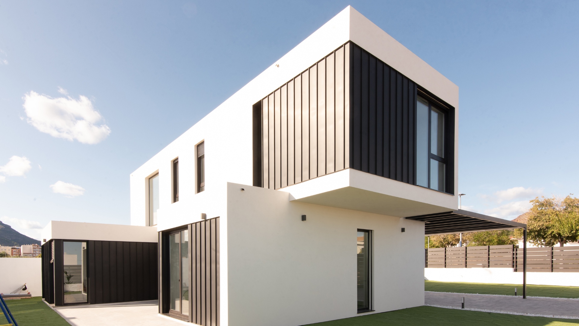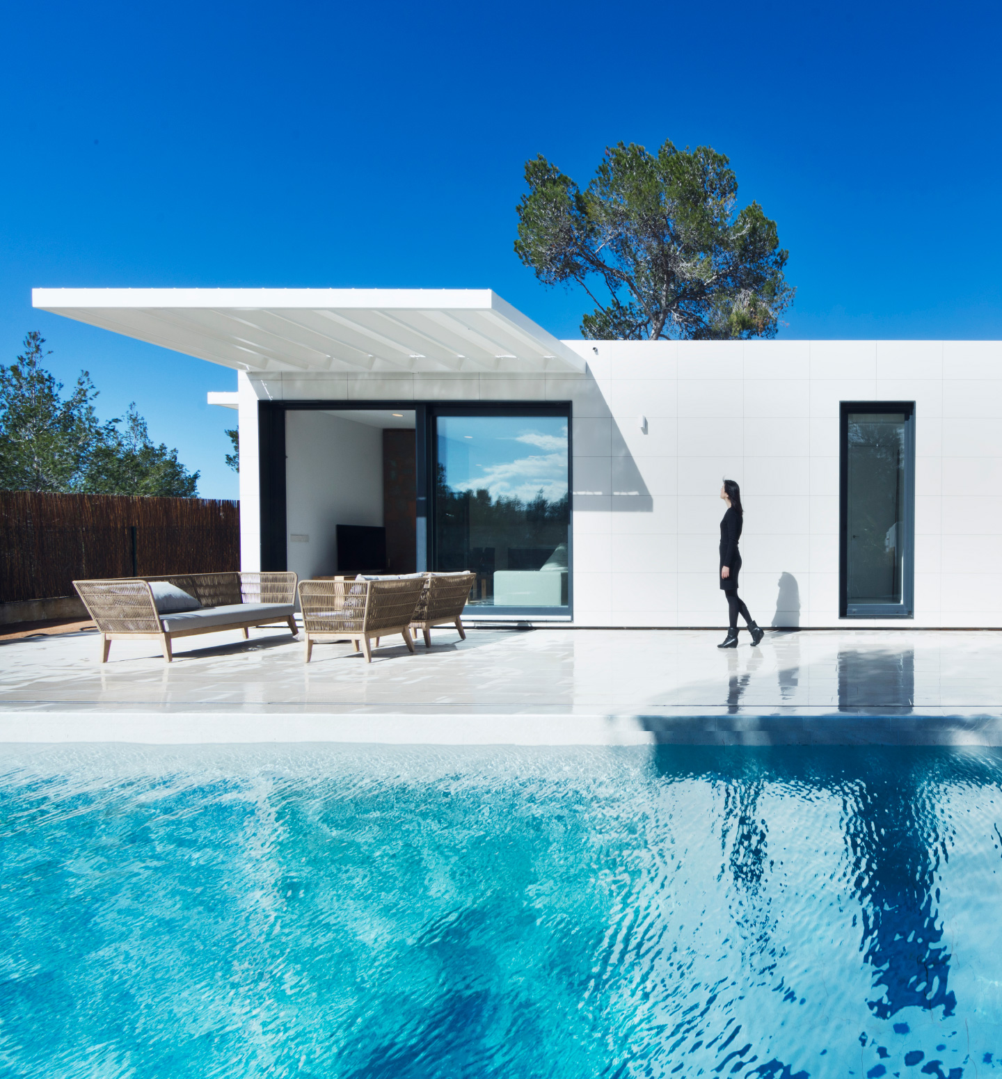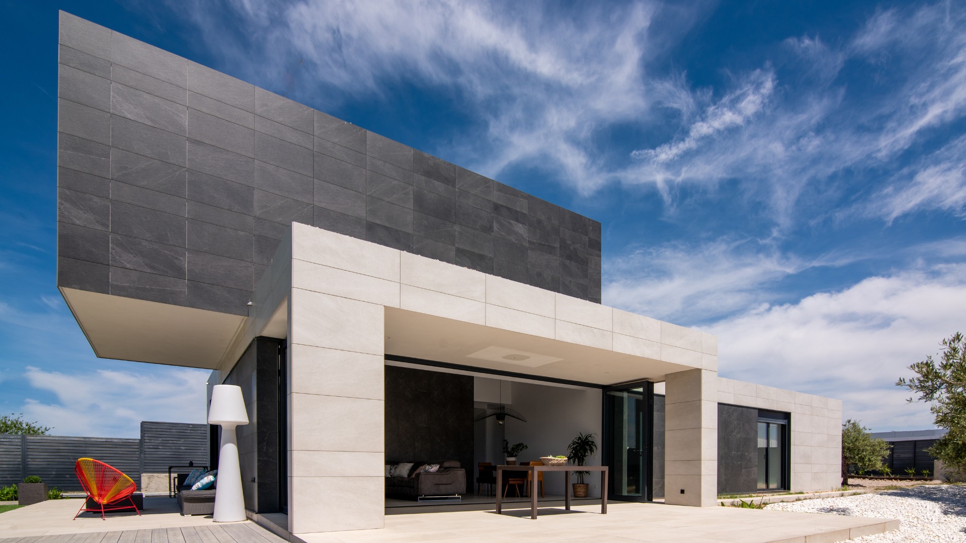 A luxury modular home featuring natural stone from Bali. This modular home is located in a residential neighbourhood near Valencia. It is a version of the Menton model from inHAUS's 111 collection.