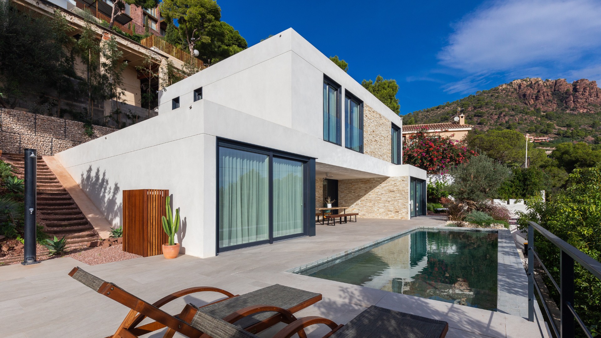 Minimalist and imbued with a Mediterranean essence, this house inspired by the Èze model offers a total surface area of 261 m² spread over two L-shaped floors. The volume is designed to shade the three independent terraces created by the volumes.