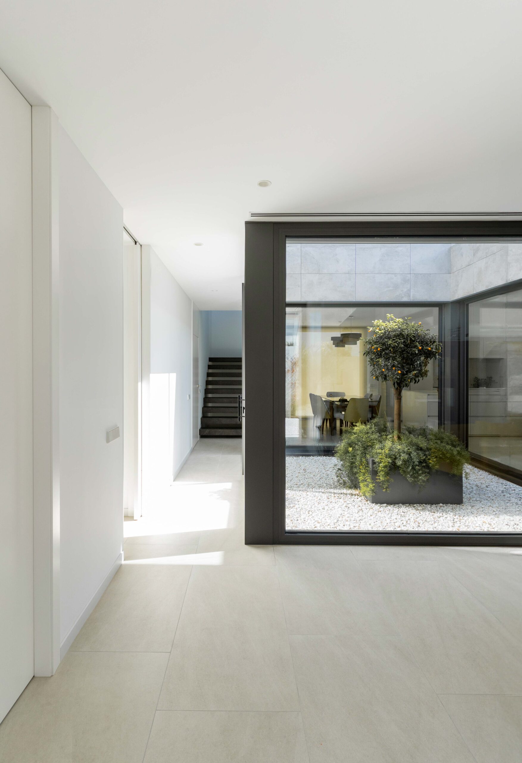 A timeless material such as porcelain stoneware, chosen in soft tones, softens its presence in the environment. A timeless material such as porcelain stoneware, chosen in soft tones, softens its presence in the environment. The landscape is reflected in its large bay windows, integrating the house into its surroundings.