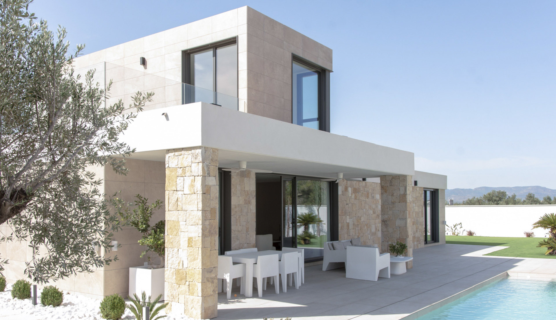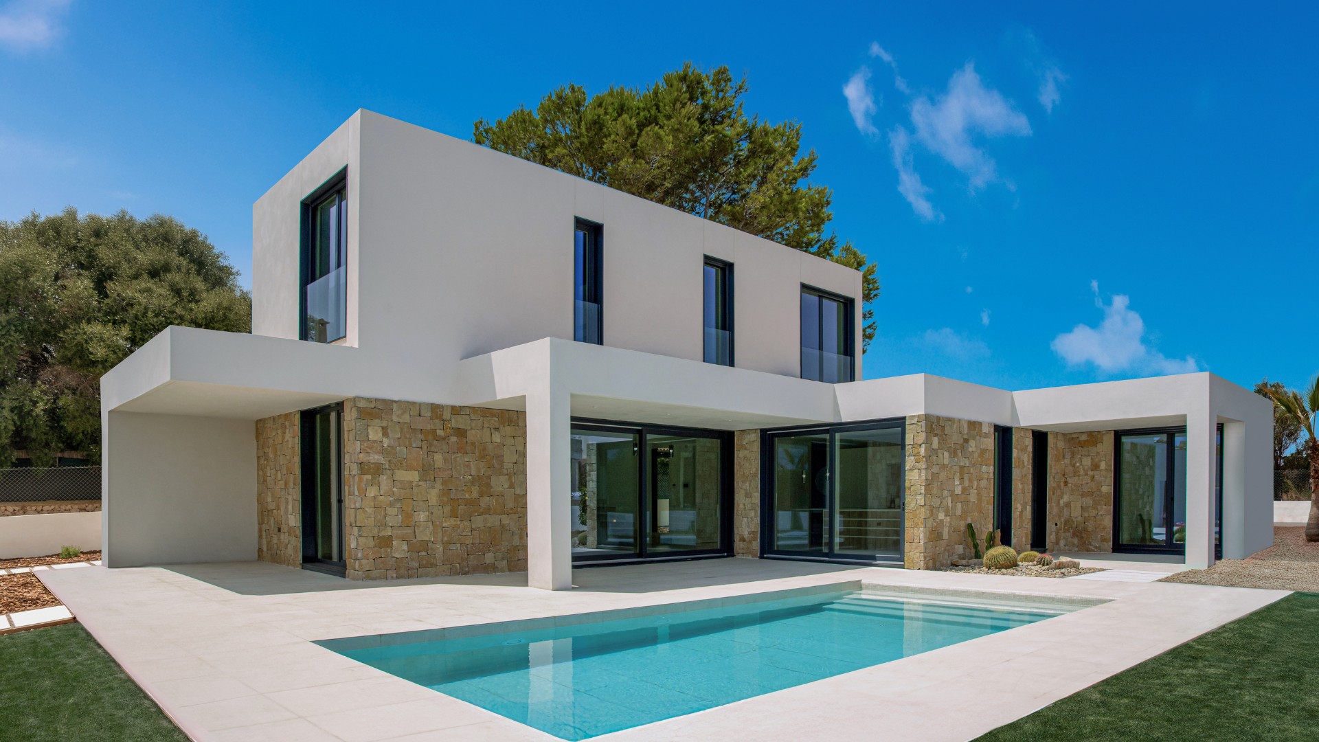 A detached house in pure Mediterranean style with a distinctly summery and modern feel. It is one of the models featured in catalogue 111: the Chantilly model, and stands out for its materials. Its natural stone façade and white tones give the Balearic architecture its unique identity.
