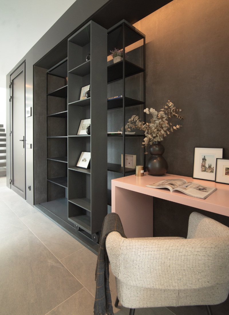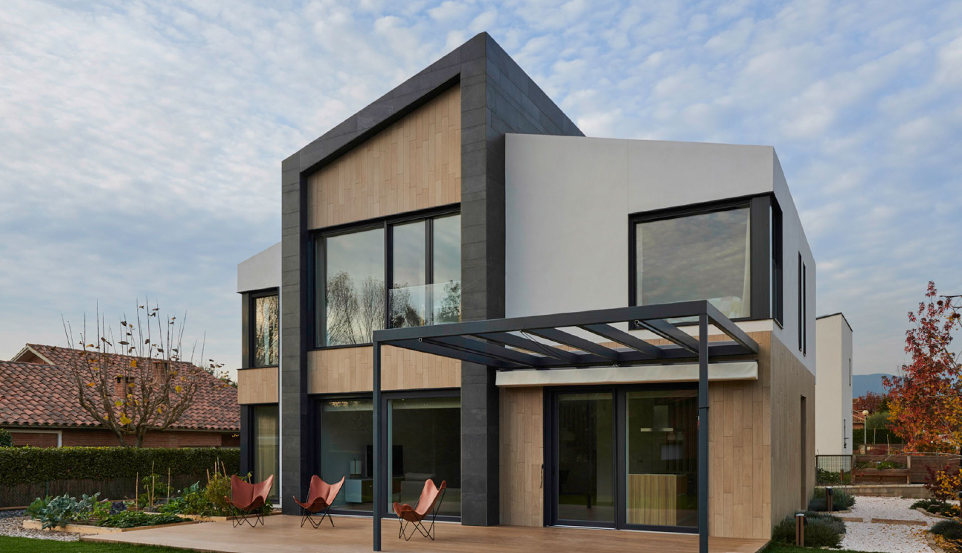 A two-storey modular house that takes advantage of the slope of the land to stand out. An original façade composed of grey and black porcelain tiles, creating a contrast between the volumes that make up the architecture of the house.