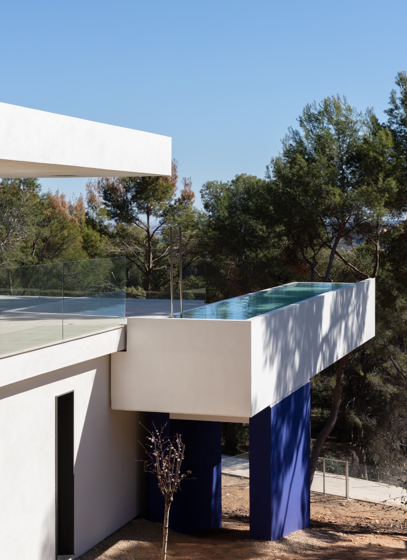 A 12-metre cantilevered swimming pool weighing 15 tonnes adds character to the complex. A large 12-metre-long swimming pool supported by powerful pillars. It appears to be suspended in mid-air. An infinity-style swimming pool with views of the horizon.