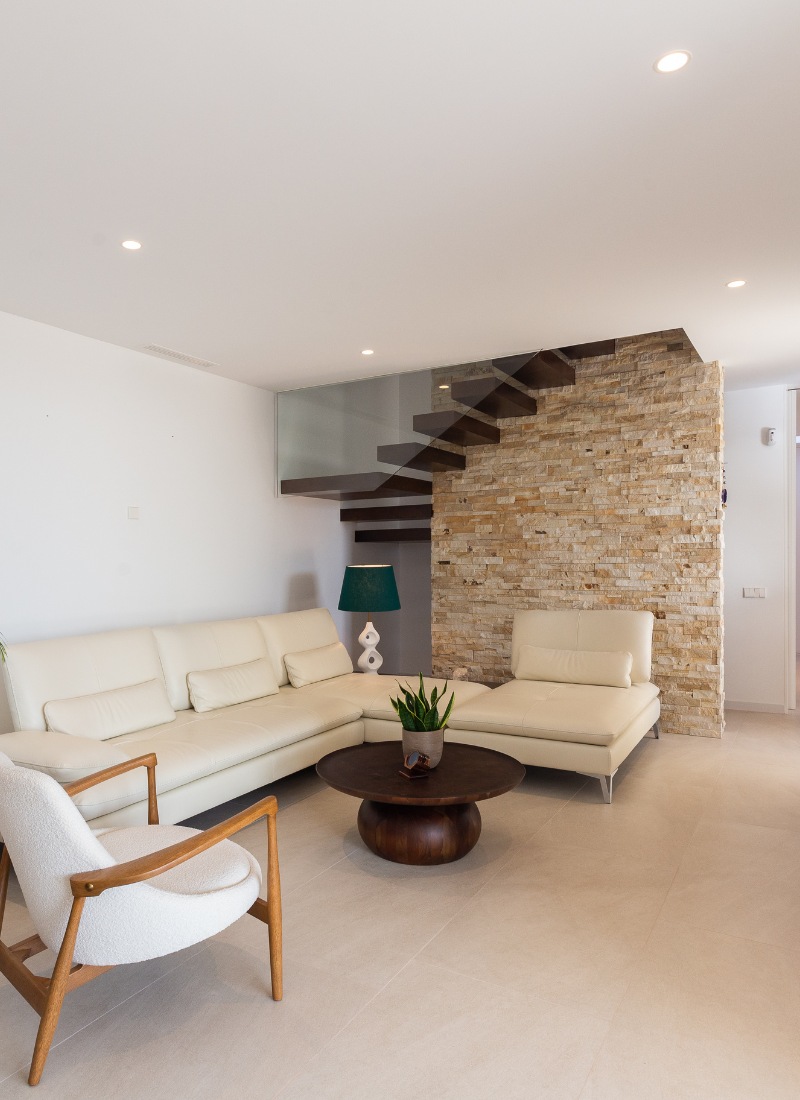 Prefabricated house in Ibiza with a total surface area of 332 m² spread over 2 floors with a modular garage. Originally based on a catalogue model, it retains most of its aesthetic features, but its layout has been modified. Purely Ibizan style and use of noble materials such as wood, natural stone and white monocouche.
