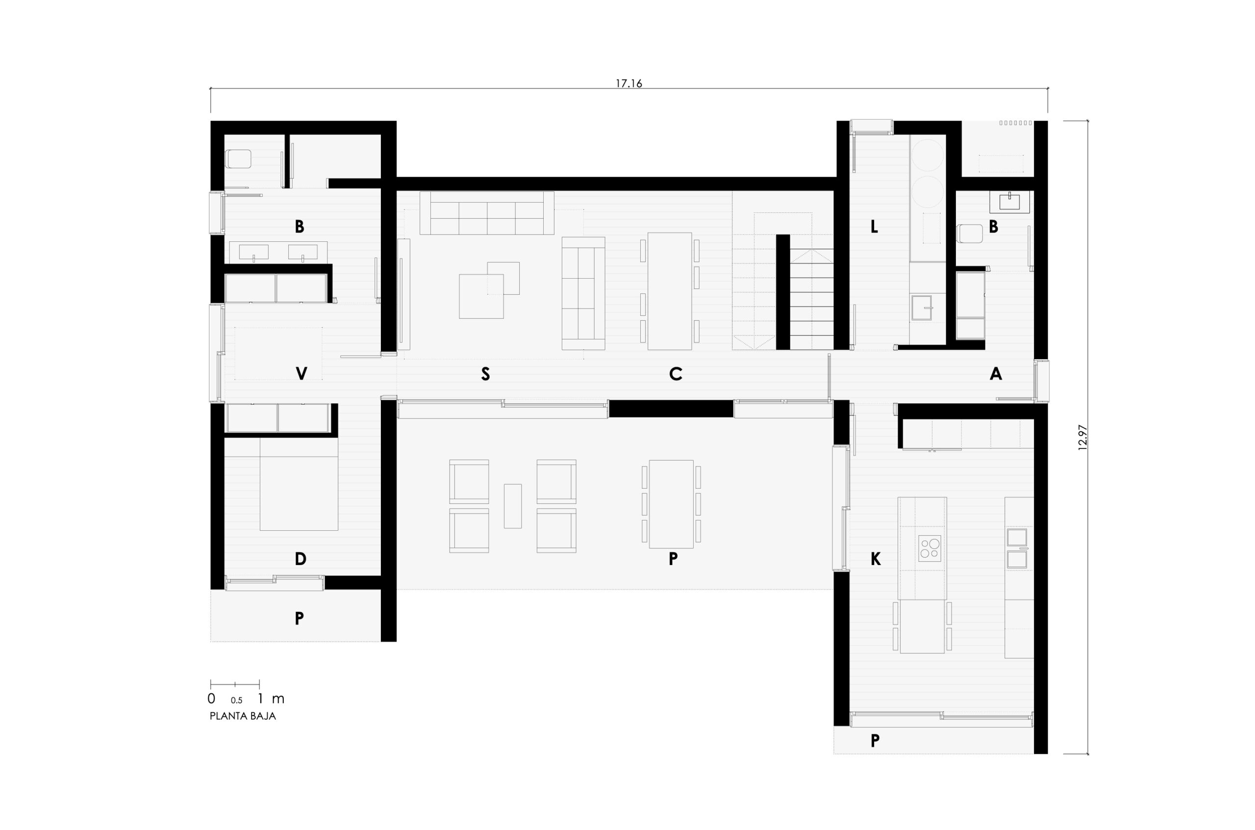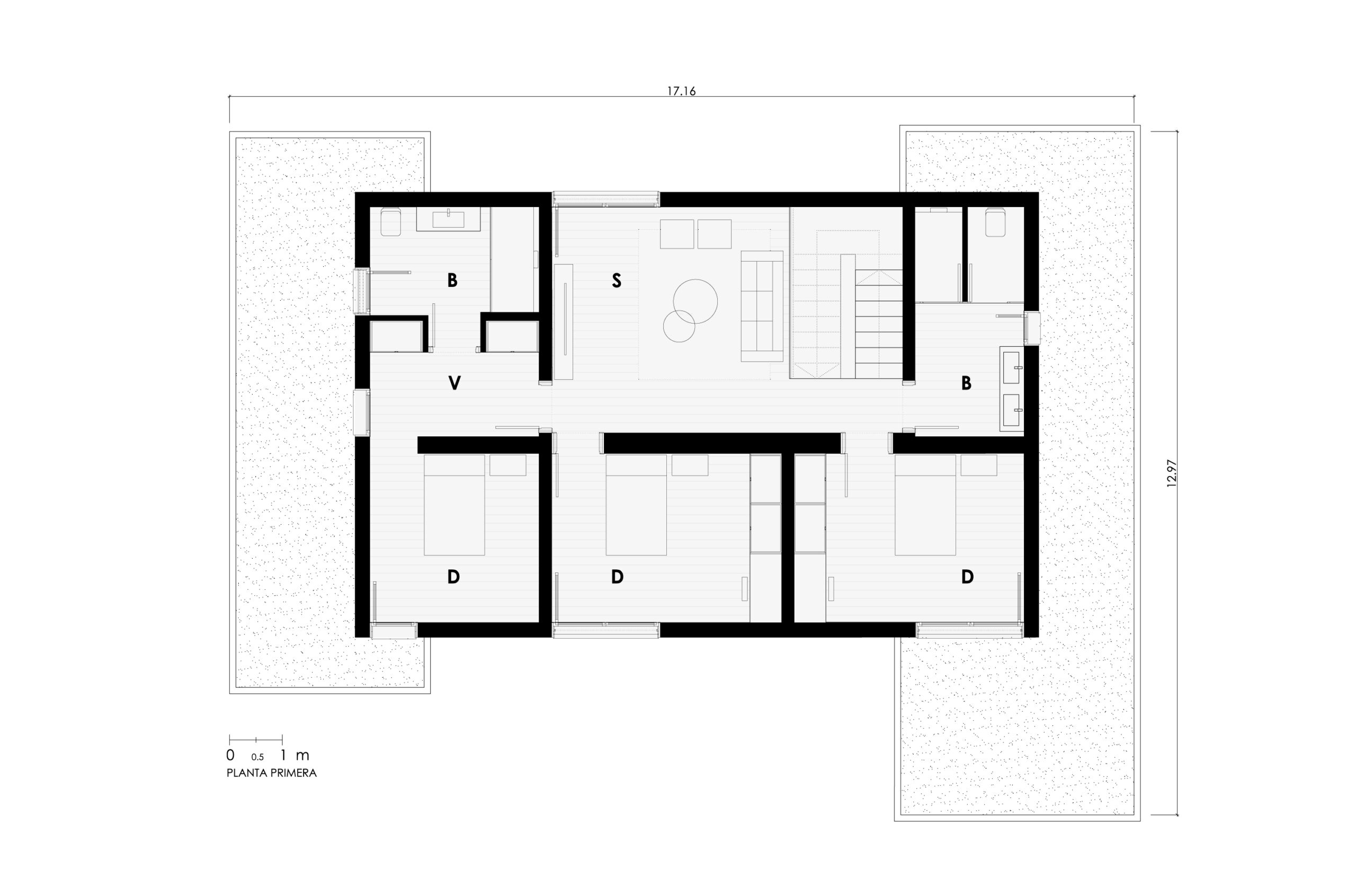 Au rez-de-chaussée, les corps aux extrémités ferment l’ensemble, générant un espace extérieur clos, relié à l’espace jour et couvert par le volume du premier étage. La zone de jour s’articule autour de cet espace pour le plaisir des familles. Toujours au rez-de-chaussée, dans un autre volume, se trouve une grande chambre de maître avec dressing et salle de bains fonctionnelle en suite. Au premier étage, on trouve trois chambres doubles, une salle de bains complète et un espace polyvalent à côté de l’escalier d’accès.
