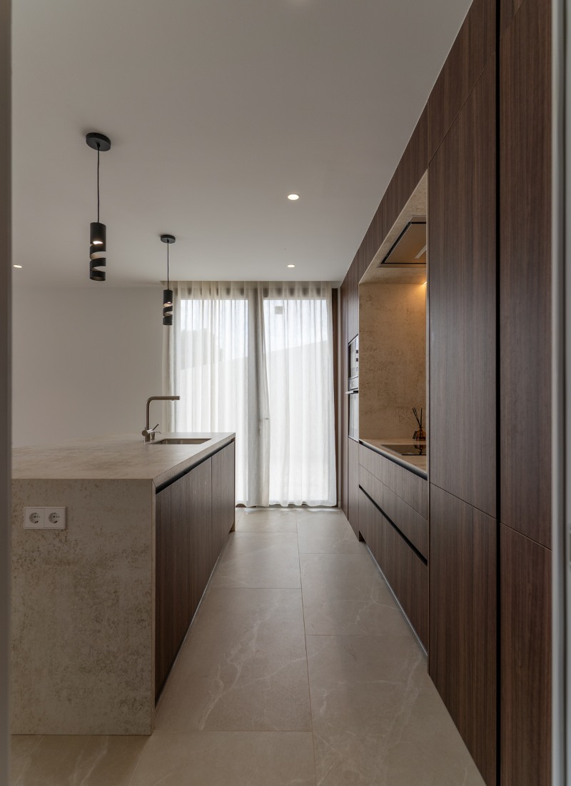 Comme la conception et la construction de ce modèle avaient pour objectif la vente rapide de la maison, le choix s’est porté sur des matériaux neutres, dominés par le style méditerranéen qui caractérise tant les îles Baléares. C’est ainsi qu’a été conçu le style d’intérieur proposé par inHAUS.
