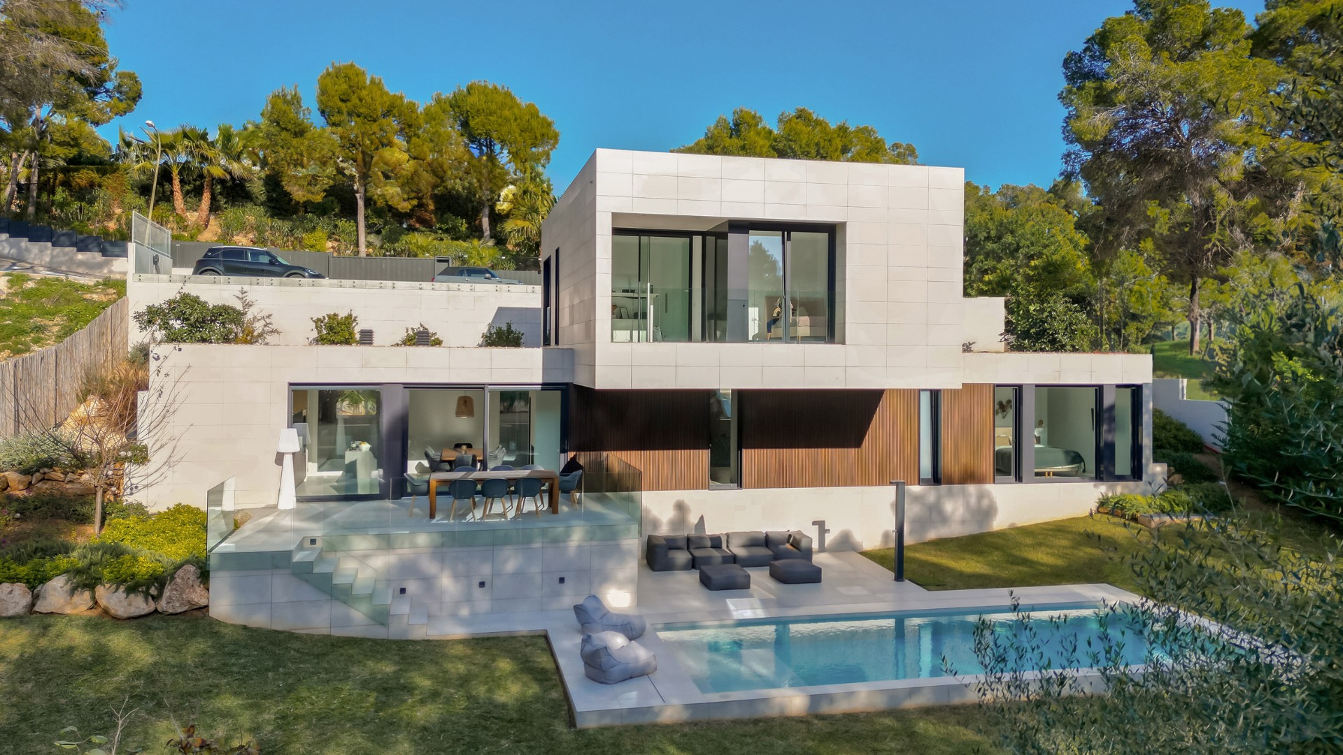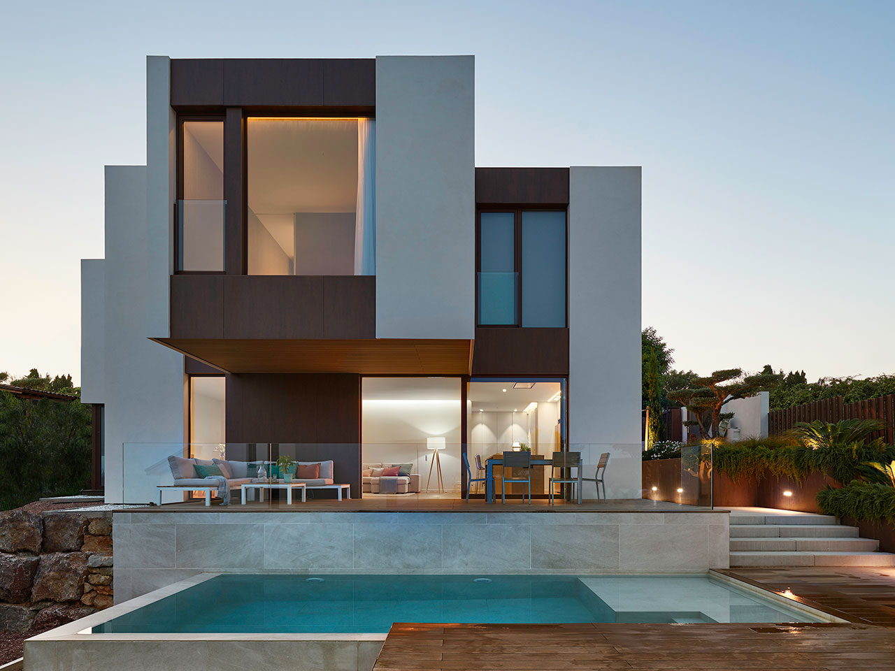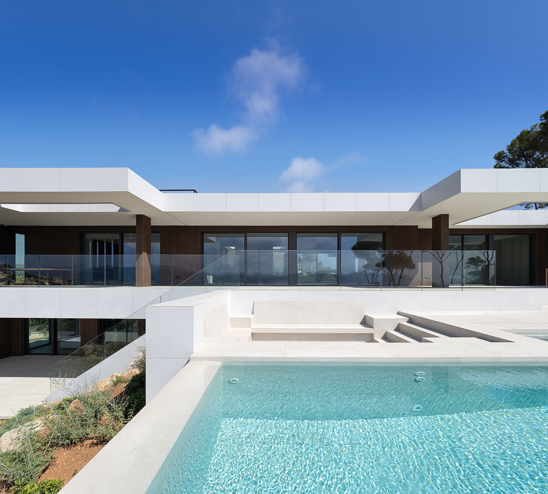 Maison unifamiliale modulaire de 342 m² répartie sur deux niveaux, conçue pour s’adapter à une forte pente naturelle. L’étage supérieur accueille les espaces de vie, ouverts sur une piscine à débordement et un spectaculaire voladizo avec vue. L’étage inférieur abrite les chambres autour d’un patio et une salle de yoga. Une architecture sobre, en matériaux naturels, en parfaite harmonie avec la pinède méditerranéenne.
