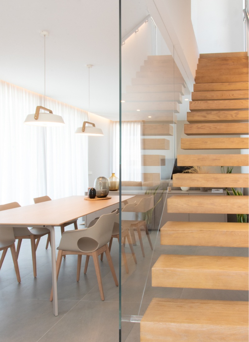 La maison parfaite pour une famille jeune, ouverte, moderne, pleine de style et faite sur mesure. Villa modulaire avec la forme d’un O sur ses deux étages. Au rez-de-chaussée, nous trouvons le hall d’entrée qui donne accès au reste de la maison.