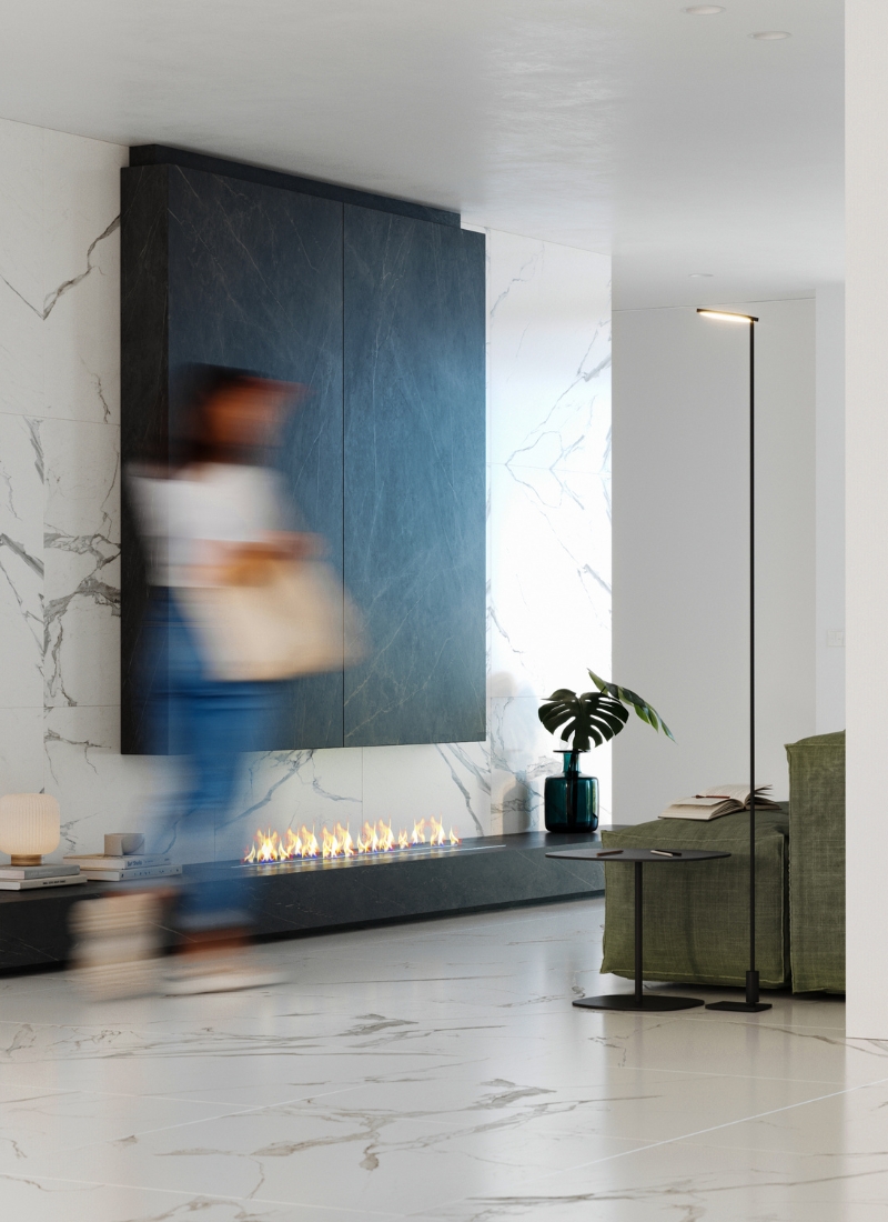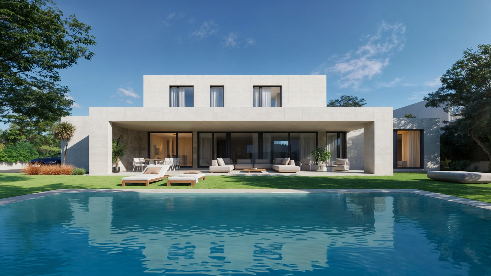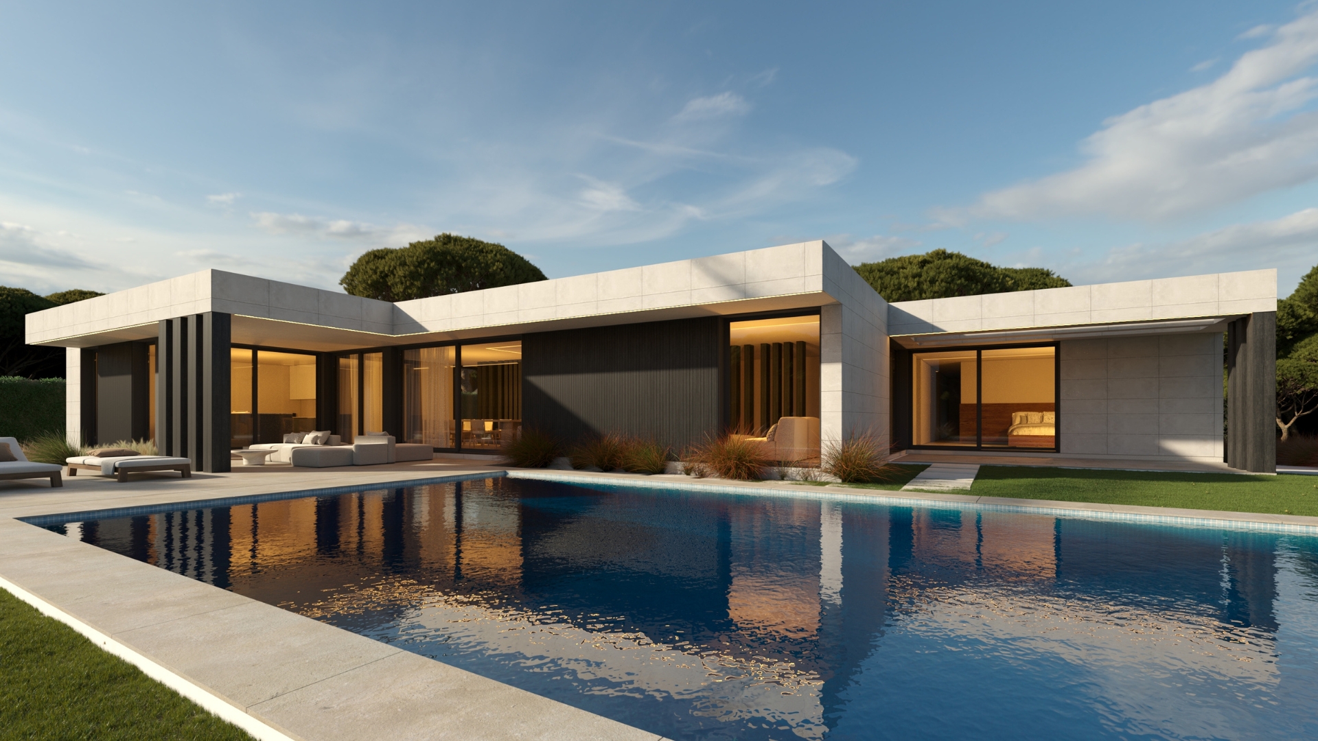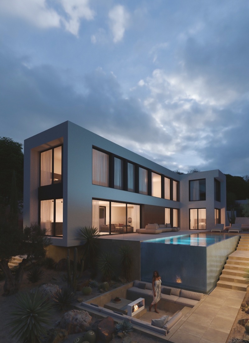 Une attention particulière aux détails du projet d'aménagement intérieur et de l'urbanisation, avec notamment une spectaculaire piscine à débordement dans un coin et un coin cheminée.
