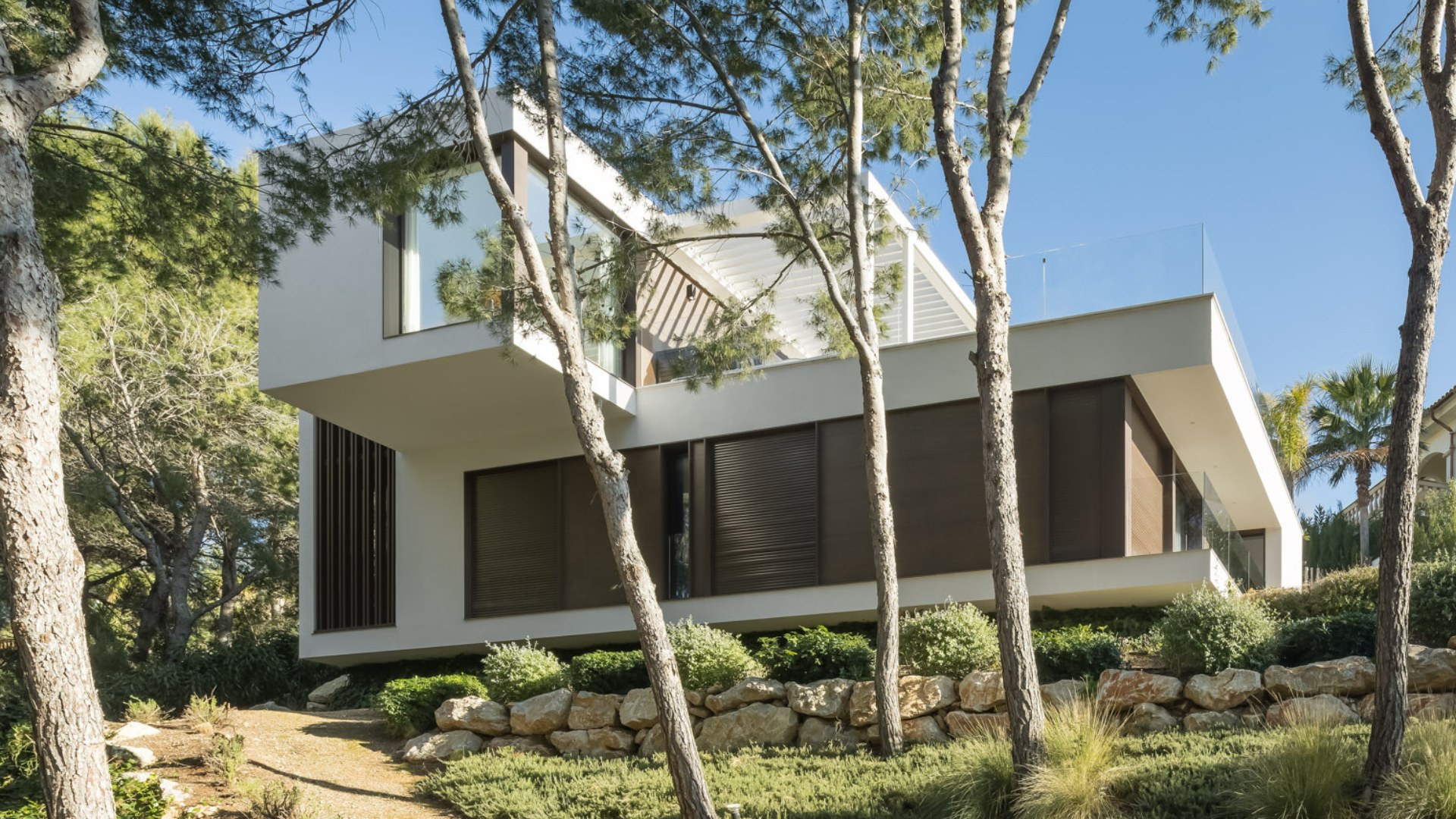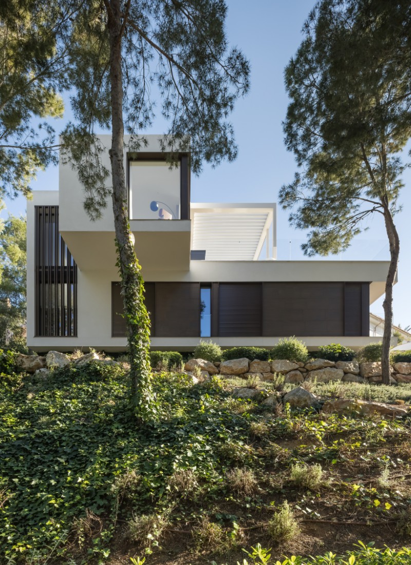 Spectaculaire maison située dans un quartier prestigieux de Majorque. Une maison qui s'adapte parfaitement au dénivelé du terrain (11 m). La particularité la plus marquante de cette résidence est qu'il s'agit d'une « maison en croix » : le volume supérieur est perpendiculaire à la construction du rez-de-chaussée, formant ainsi une silhouette attrayante, avec deux porte-à-faux, reposant sur les deux façades principales.