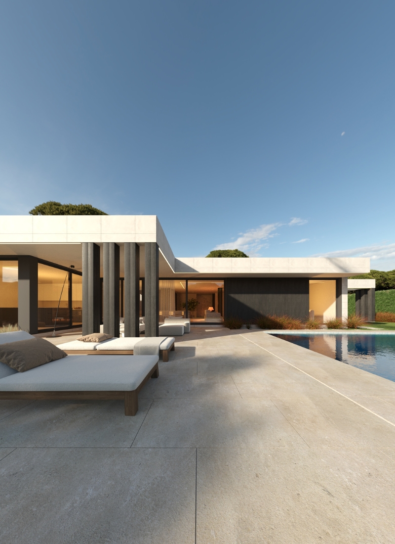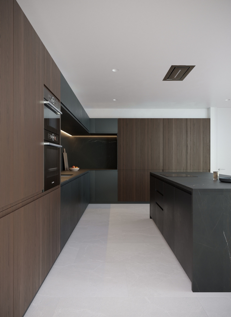 La distribution compacte en forme de « O » de cette maison reflète clairement le mode de vie du client. Un programme qui comprend une salle de cinéma et trois suites complètes où chaque membre dispose de ses propres espaces de repos, de lecture et de loisirs, ainsi que d’un dressing et d’une salle de bains.