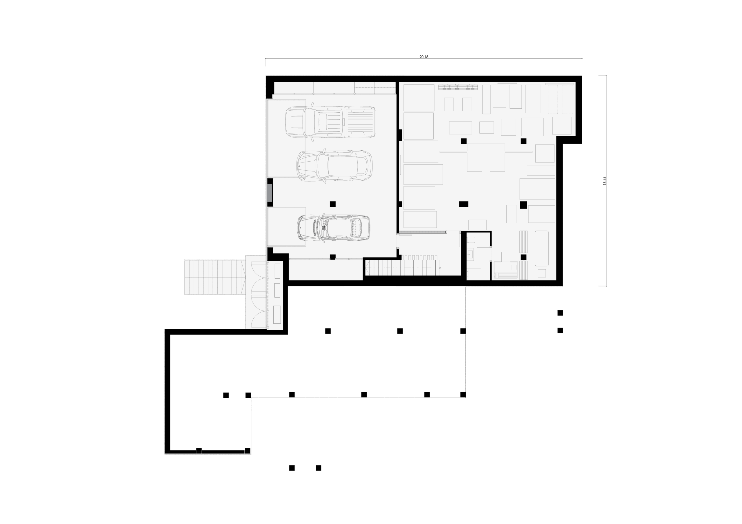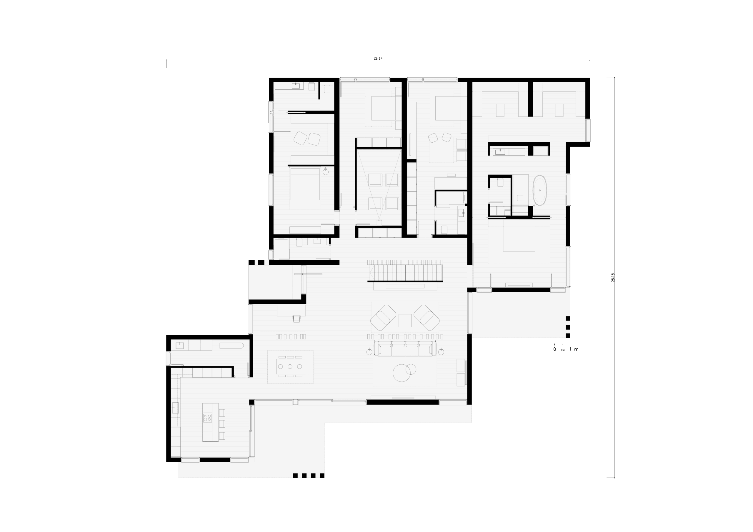 Au total, 459 m² ont été construits au rez-de-chaussée et 668 m² en sous-sol. La distribution est conçue pour qu’une famille puisse cohabiter tout en respectant l’individualité et le mode de vie de chaque membre. Au total, trois chambres complètes avec salle de bains attenante, chacune disposant d’un espace de détente dédié à la lecture. Un programme de logement compact, pour lequel une solution a été proposée pour les travaux en sous-sol, avec un sous-sol comprenant un espace de loisirs et une salle de sport.