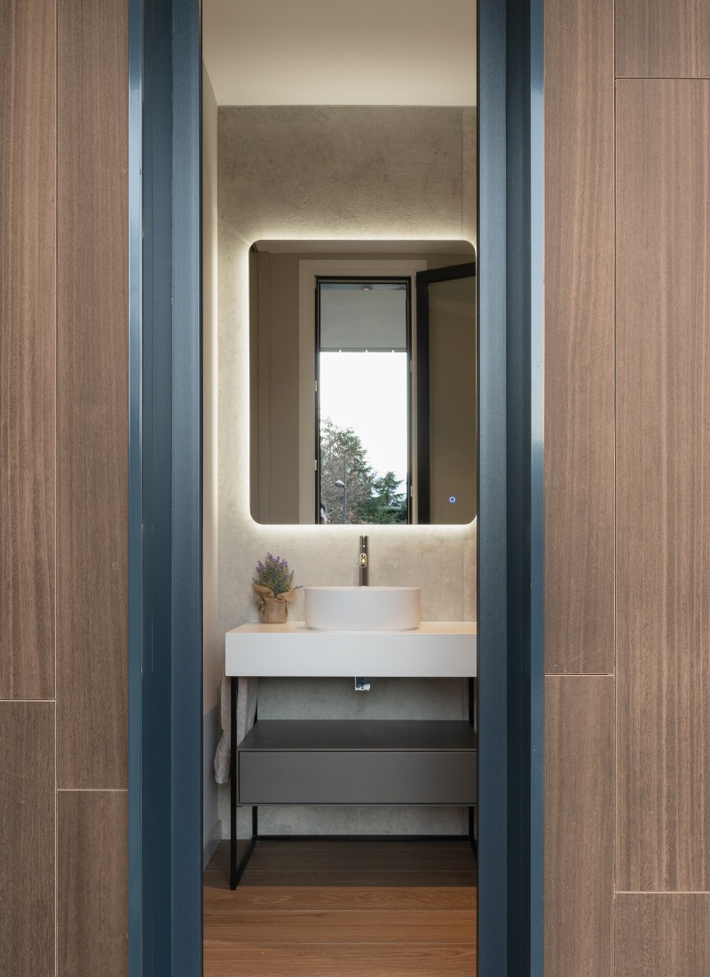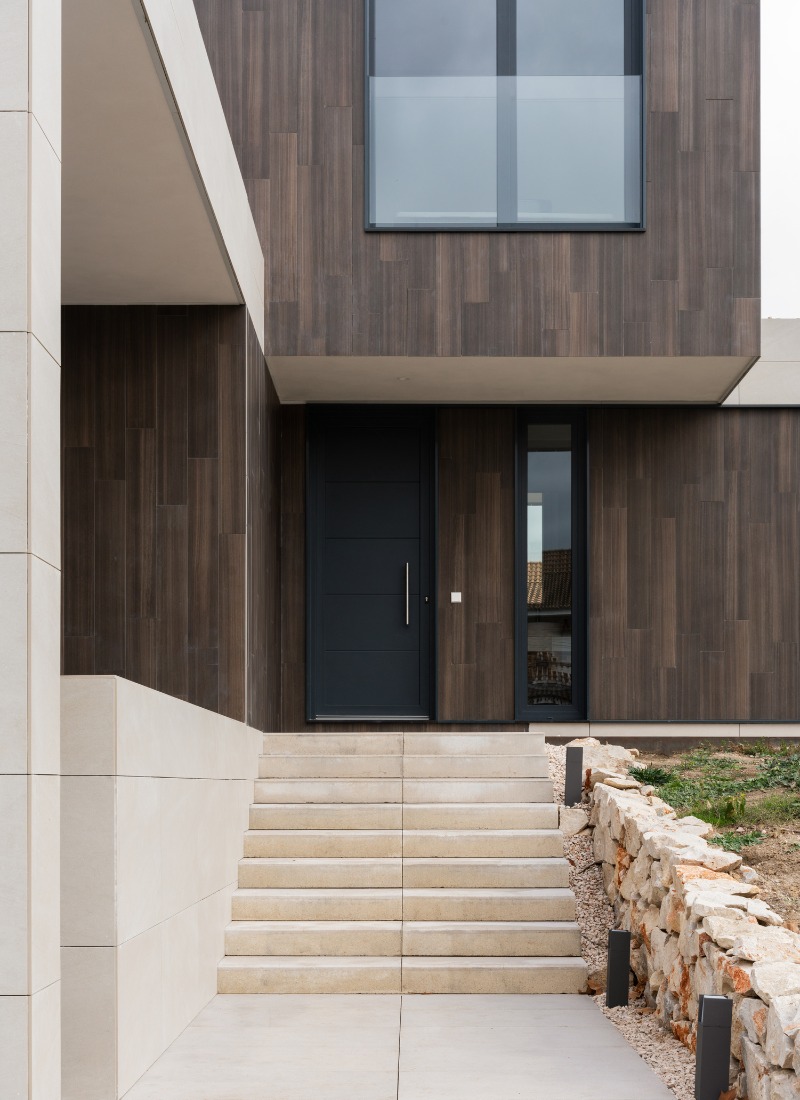 Le naturel avec lequel les matériaux s’harmonisent confère à l’ensemble une atmosphère de bon goût et de belle simplicité. La pierre du mur d’accès, les tons bois de la façade et les carreaux de céramique grand format deviennent des ingrédients nobles qui font de l’accueil un moment spécial.