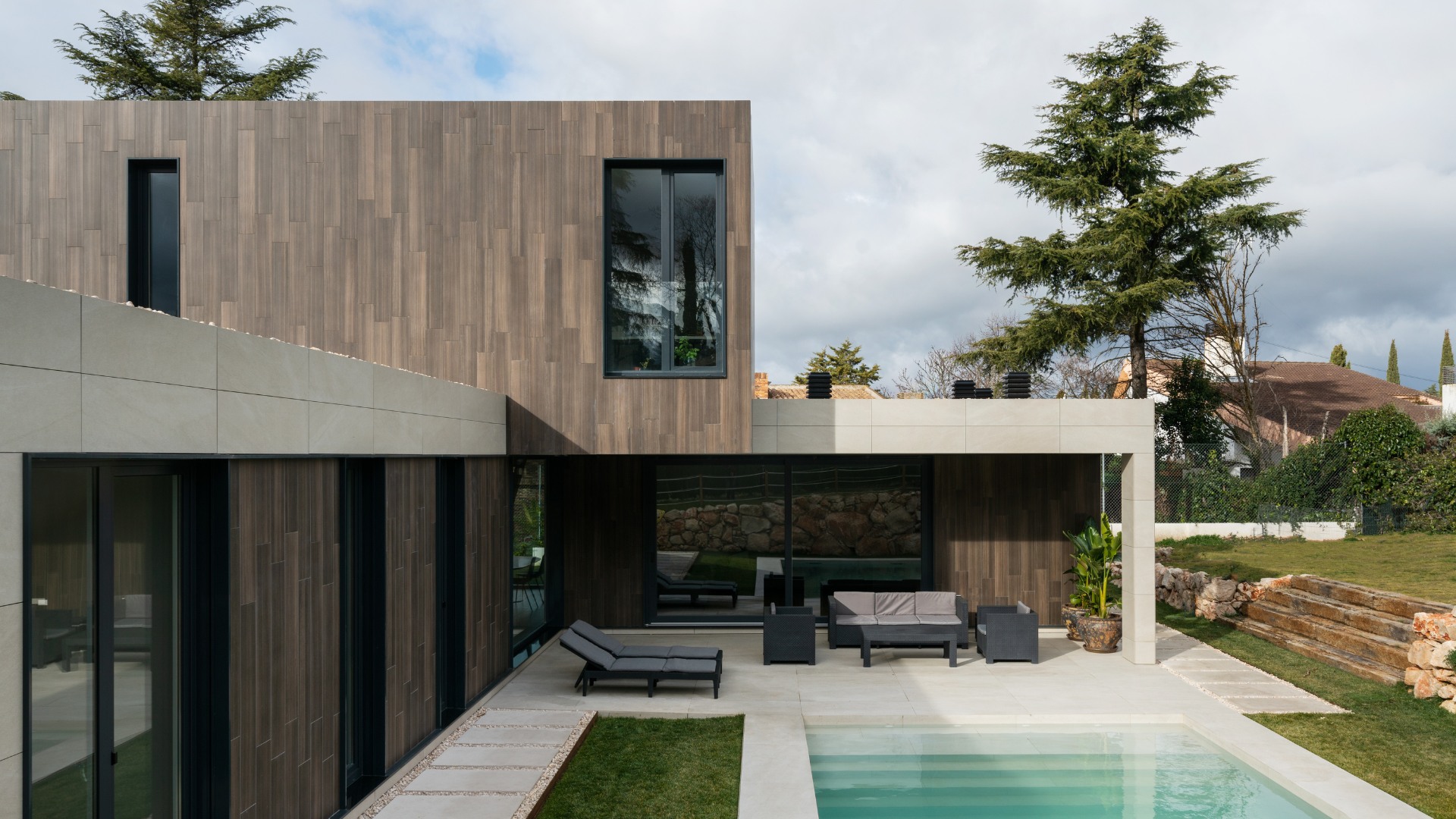 Le rez-de-chaussée de cette maison modulaire à Madrid présente une forme en L qui permet de préserver l’intimité familiale dans la zone de la terrasse et de la piscine.