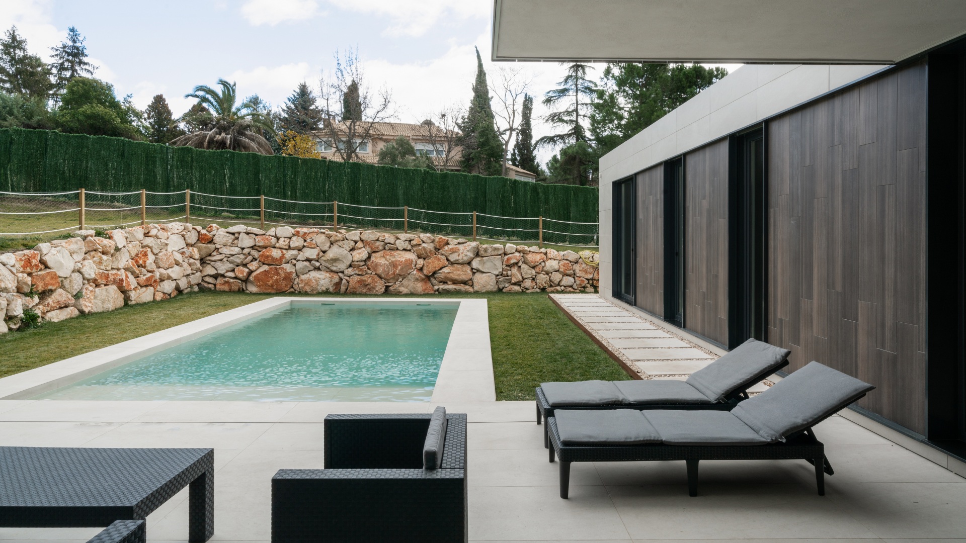 Donnant sur le jardin arrière, un porche et le volume de l’étage supérieur créent un espace couvert accessible depuis un vaste salon. De plus, un terrain sur deux niveaux différents permet de préserver un maximum d’intimité dans cet espace de détente confortable, où quelques touches méditerranéennes occupent le devant de la scène.