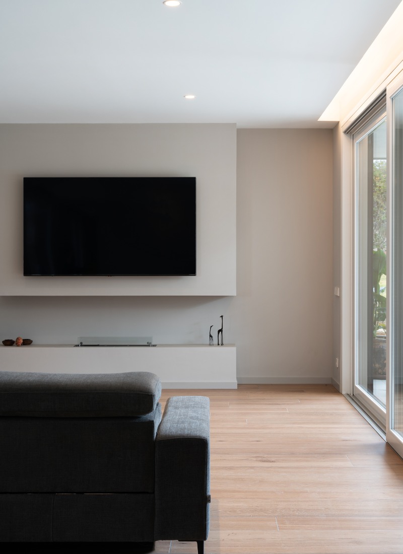 Les grandes baies vitrées, comme celles de la chambre principale de cette maison, sont une autre caractéristique distinctive d’inHAUS. Il en va de même pour les lumières indirectes et les corniches. De petits détails qui confèrent de la grandeur à un design moderne.