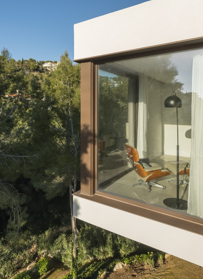 La partie inférieure semble léviter au-dessus du sol. Sans aucun support visible, l’impression que la villa vole au-dessus du terrain génère ce sentiment de tranquillité et de paix qui caractérise ce projet.