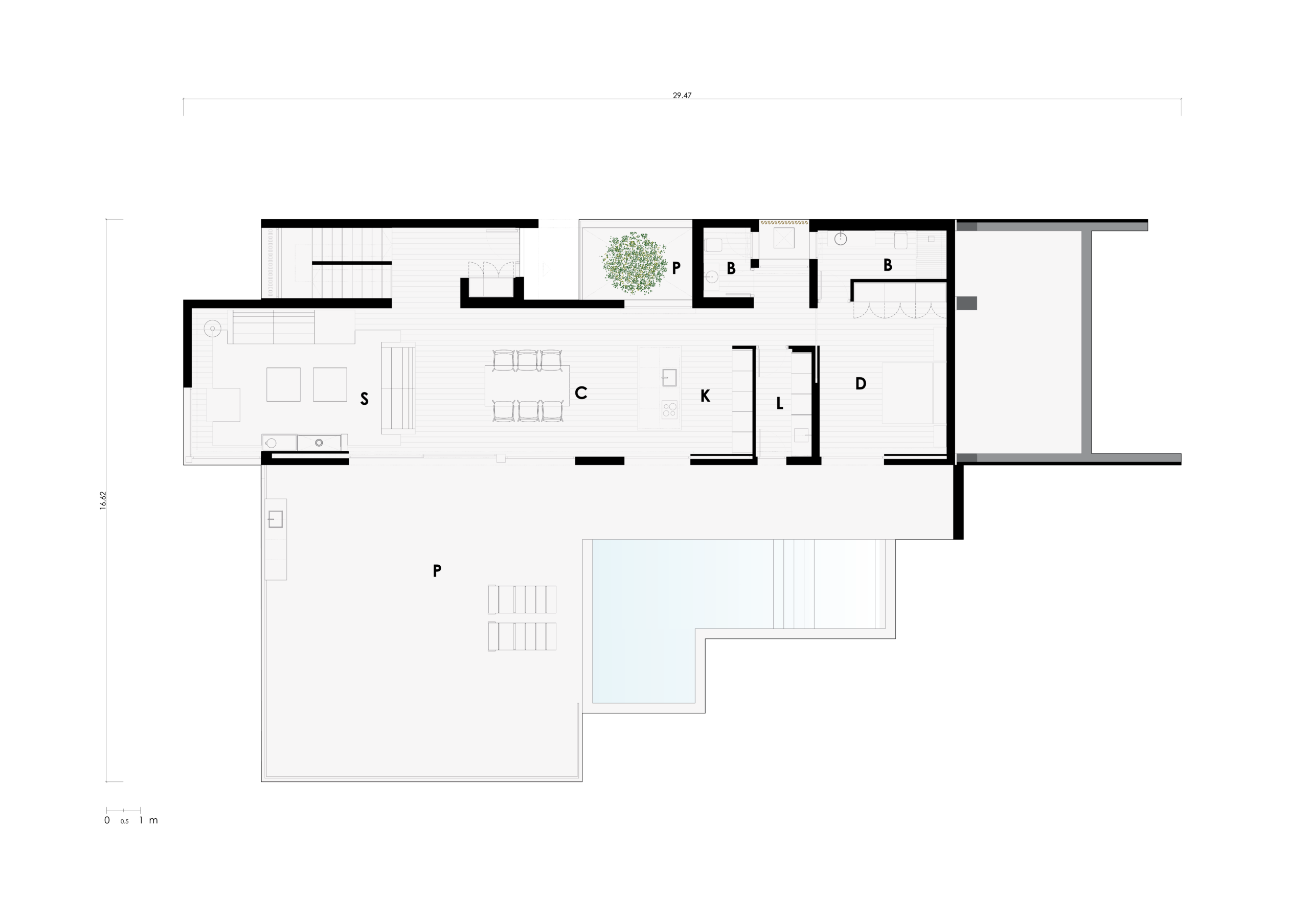 La maison s’adapte à une forte pente naturelle grâce à une distribution sur deux niveaux distincts. L’étage supérieur accueille les espaces de vie — salon, cuisine, salle à manger et bureau — en lien direct avec la terrasse et la piscine, créant une plateforme ouverte sur le paysage. Le rez-de-chaussée abrite les chambres, salles de bain et zones plus privées, organisées autour d’un patio qui apporte lumière naturelle et ventilation croisée. À ce niveau, on trouve également une salle de yoga, conçue comme un espace de calme en connexion visuelle avec la nature. L’escalier intérieur en métal constitue la colonne vertébrale du projet, assurant une transition fluide entre les deux niveaux et la pinède environnante.