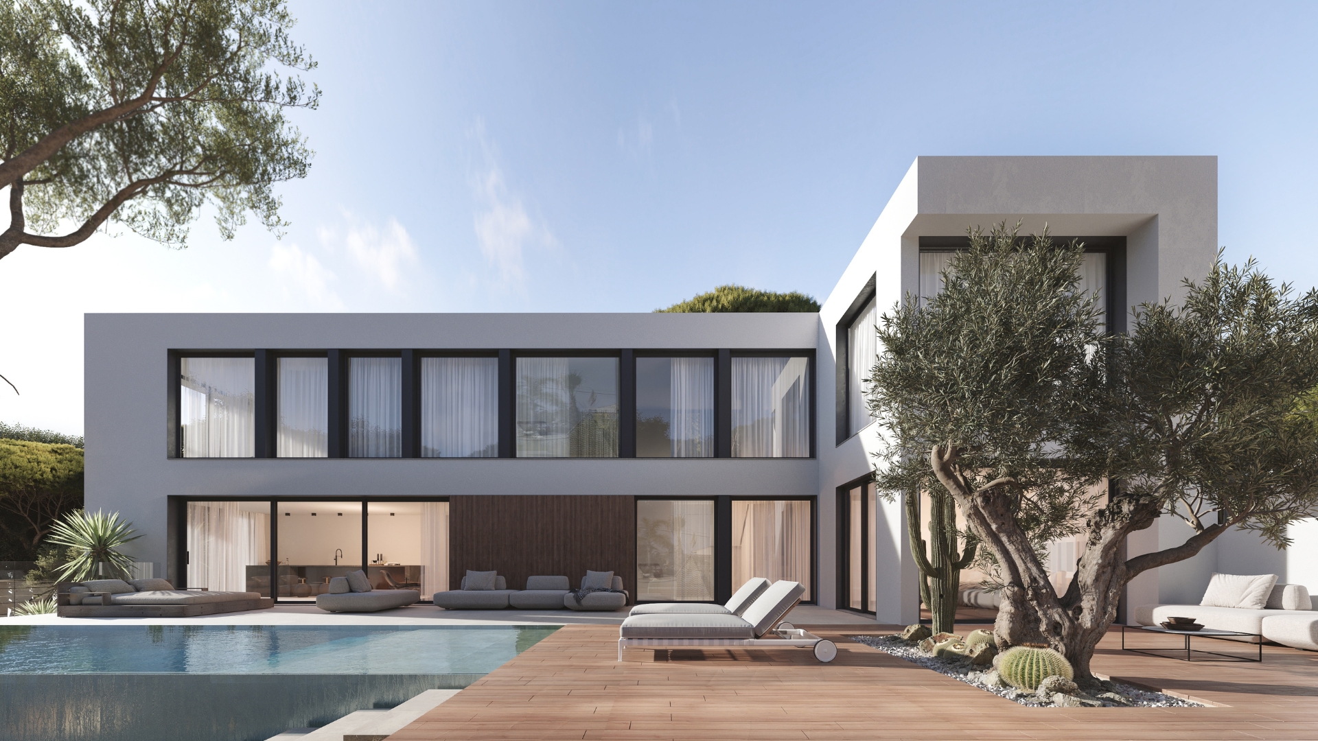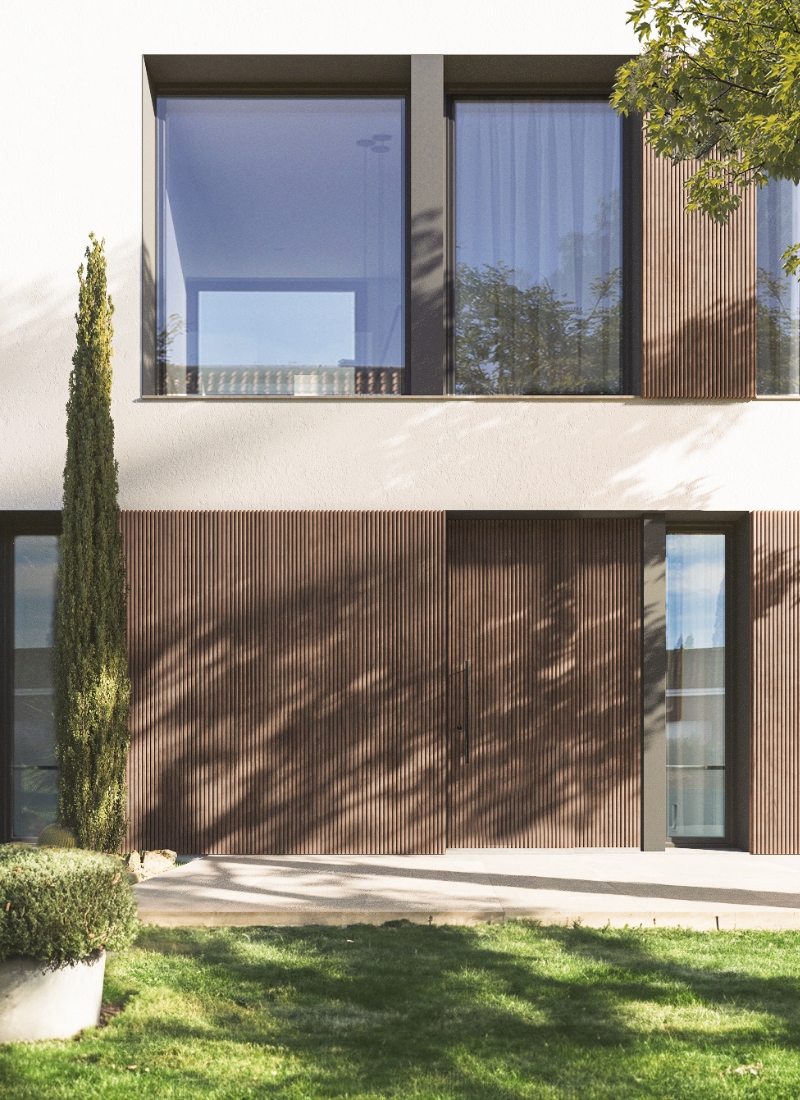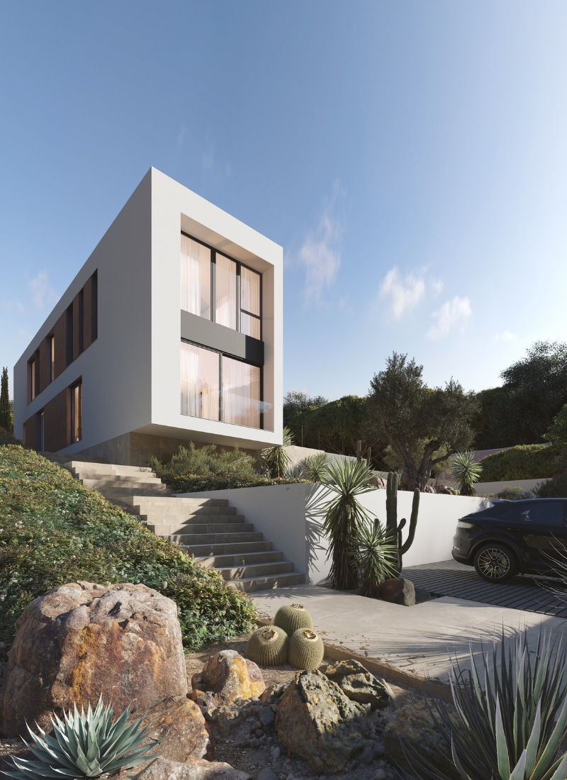 Une distribution en L et un style méditerranéen classique avec une façade recouverte de bois technologique et d’un monocouche blanc. Une maison à l’esthétique compacte qui reflète une incroyable sensation d’espace grâce aux grandes baies vitrées qui définissent sa structure et aux trois mètres de hauteur libre dont dispose le rez-de-chaussée.
