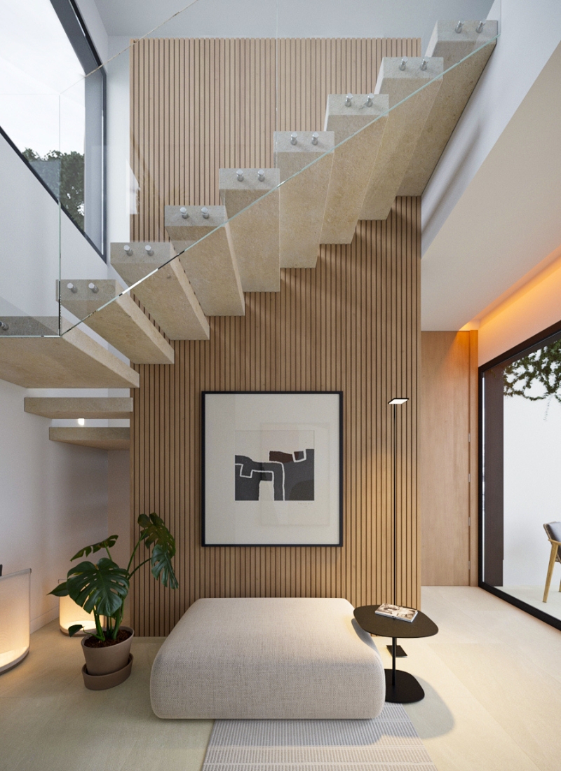 Elle détaille également les besoins des clients qu’elle a dû planifier et satisfaire avec nous. Des hauteurs sous plafond de trois mètres, de grandes baies vitrées pour communiquer avec l’environnement et d’autres détails qui caractérisent le projet. La collaboration avec Claudia en tant qu’architecte d’intérieur a été essentielle pour pouvoir répondre à tous les besoins et goûts de nos clients. Le résultat final est, selon les mots de Claudia, « une maison spectaculaire qui dépasse les designs et les rendus du projet ».