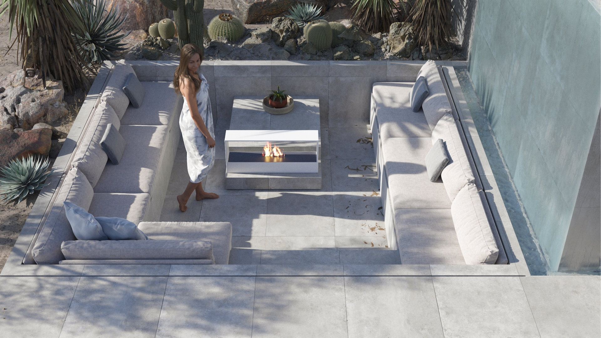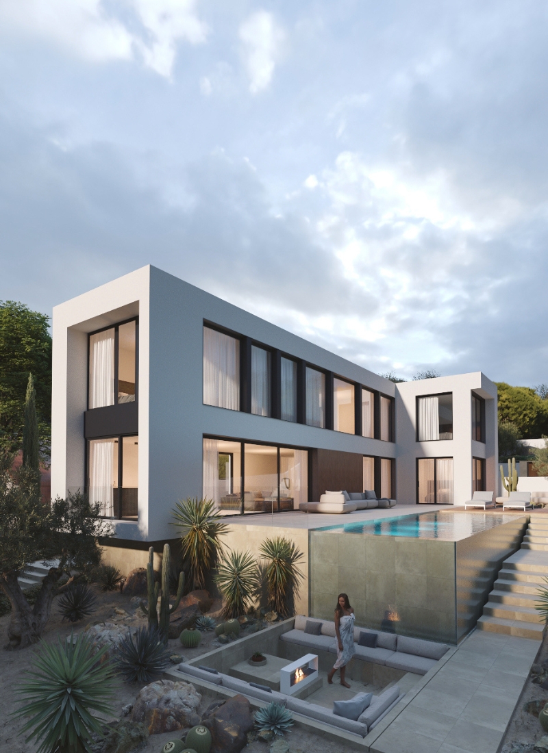 L’objectif principal de la conception était d’obtenir une connexion fluide entre l’intérieur et l’extérieur, en soignant au maximum les détails du projet d’aménagement intérieur et de l’urbanisation, avec notamment une spectaculaire piscine à débordement dans un coin et un coin cheminée.